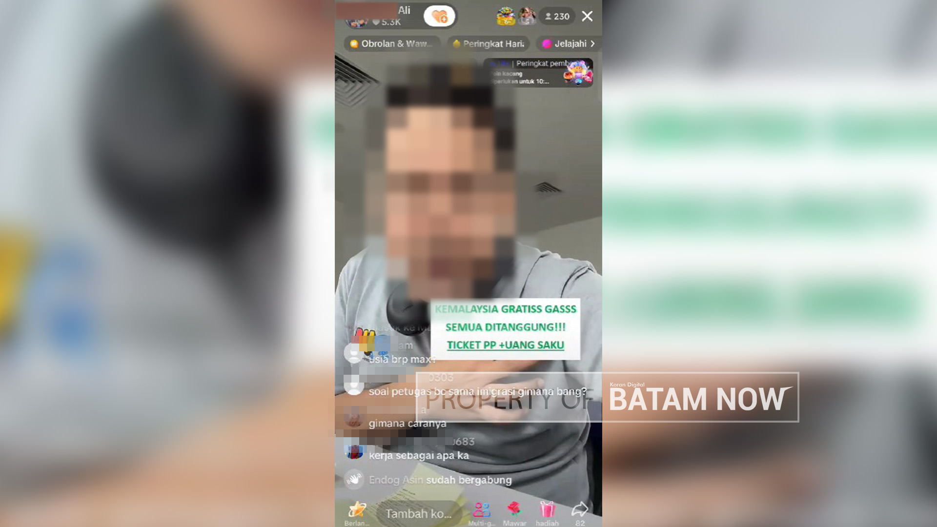 Ia menawarkan jalan-jalan gratis ke Malaysia lewat siaran langsung (live). Dan ia sesumbar mengklaim kegiatan itu aman karena petugas di pelabuhan di Batam sudah diatur.