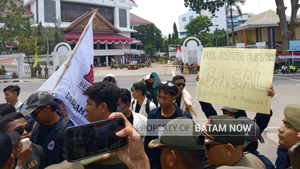 BatamNow.com – Puluhan mahasiswa yang tergabung dalam Badan Eksekutif Mahasiswa (BEM) SI Kerakyatan Daerah Kepulauan Riau (Kepri) melakukan aksi unjuk rasa di Kantor DPRD Kota Batam, pada Rabu (27/08/2025).