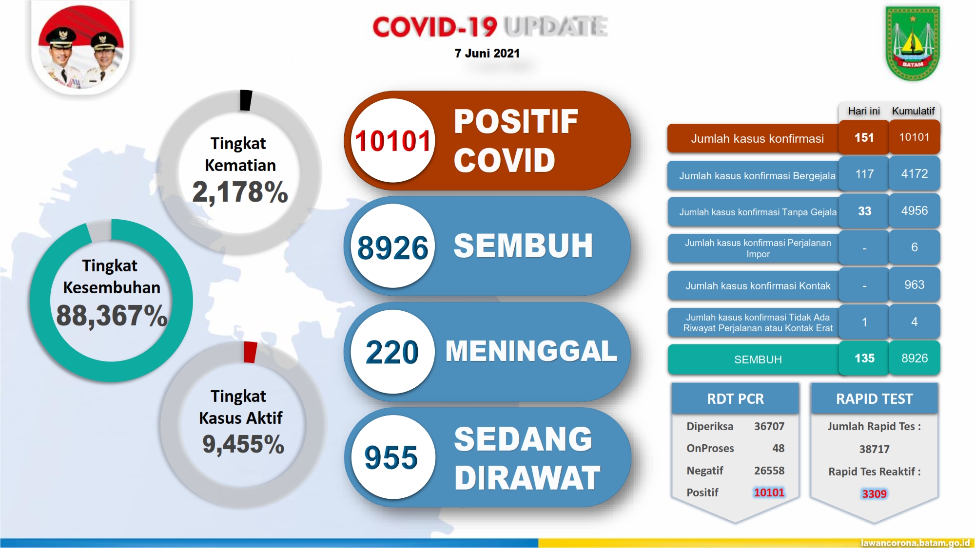 Sehingga data kumulatif Covid-19 Kota Batam per 7 Juni 2021 adalah 10.101 positif, 8.962 sembuh, 220 meninggal dan 955 sedang dalam perawatan.