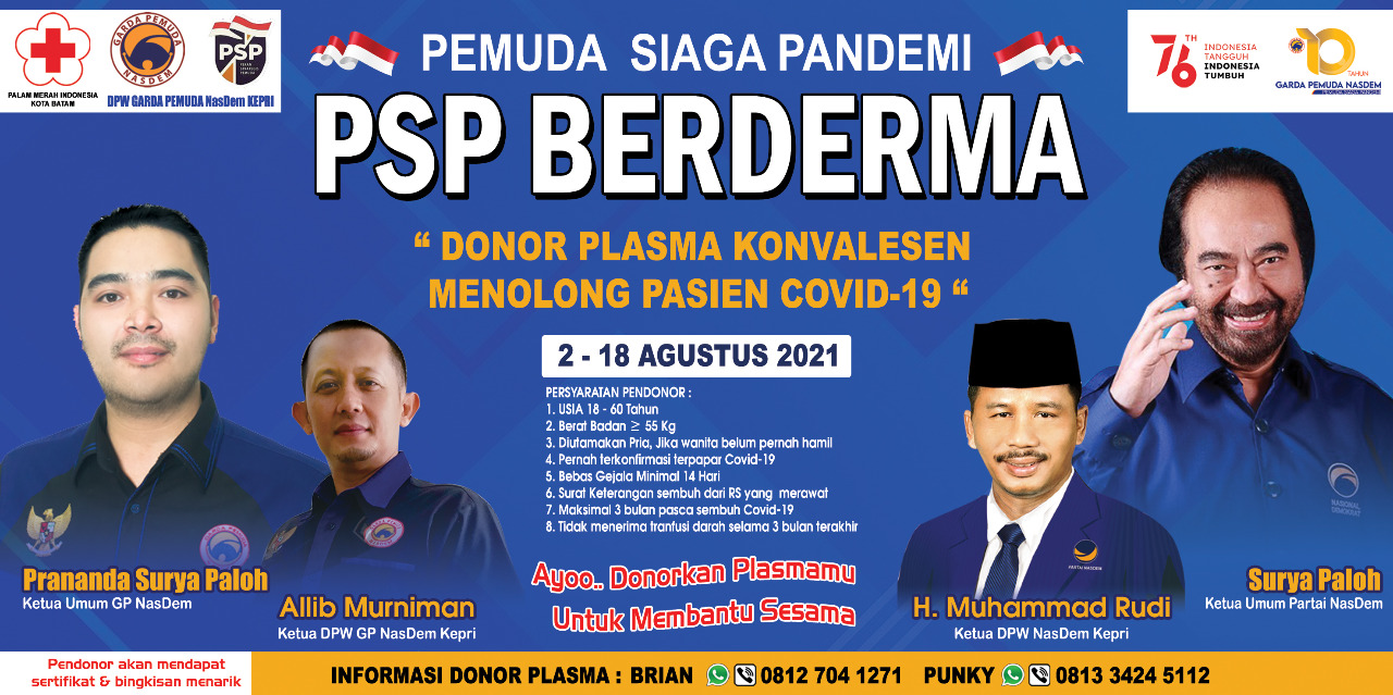 BatamNow.com – Menjelang Hari Ulang Tahun (HUT) Kemerdekaan RI yang ke-76, sempena dengan HUT Garda Pemuda NasDem ke-10, Pemuda Siaga Pandemi (PSP) DPW Garda Pemuda NasDem Kepri menggelar Donor Darah dan Donor Plasma Konvalesen untuk membantu sesama. Rangkaian program yang dinamai PSP “Berderma” (Bersama Donor Plasma) tersebut dilakukan sejak tanggal 2 -18 Agustus 2021.