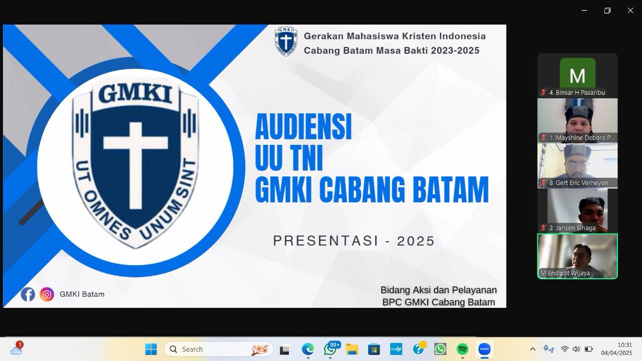 Dalam hal ini, Badan Pengurus Cabang Gerakan Mahasiswa Kristen Indonesia Kota Batam (BPC GMKI Kota Batam) mengadakan audiensi secara daring dengan Anggota Komisi I DPR RI Endipat Wijaya yang turut dalam perumusan revisi UU TNI, Jumat (04/04/2025).