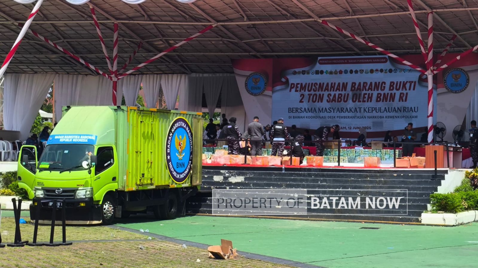 BatamNow.com – Dari 2 ton narkotika jenis sabu-sabu dalam 2.000 kemasan yang dihadirkan di Alun-alun Engku Putri Batam, hanya 30 bungkus yang dimusnahkan menggunakan incinerator di lokasi, Kamis (12/06/2025).
