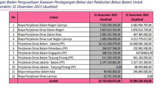 Dalam laporan keuangan BP Batam tahun 2023 yang dirilis BPK pada tahun 2024, total biaya belanja perjalanan dinas selama setahun sebesar Rp 33,7 miliar lebih.