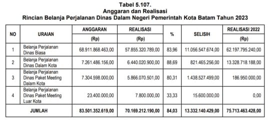 Tabel rincian biaya anggaran dan realisasi perjalanan dinas Pemko Batam tahun 2023. (Grafis: Laporan Keuangan Pemko Batam)