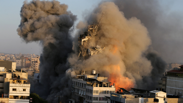Asap dan api membumbung dari gedung menara saat dihancurkan oleh serangan udara Israel di tengah maraknya kekerasan Israel-Palestina, di Kota Gaza, Rabu (13/05/2021). (F: Ibraheem Abu Mustafa/ REUTERS)