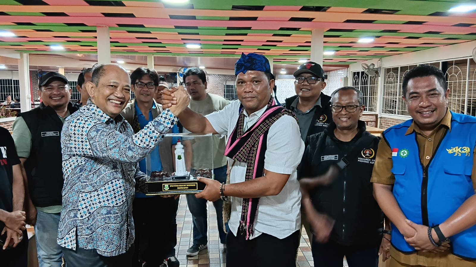 Usai ramah tamah, Kadisnaker Banten Septo Kalnadi selaku tuan rumah menyerahkan cinderamata kepada Ketua PWI Kepri Saibansah Dardani, Ketua PWI Bintan Harjo, serta Ketua PWI Batam yang diwakili oleh Tunggul Manurung, sebagai simbol penghormatan dan kebersamaan.
