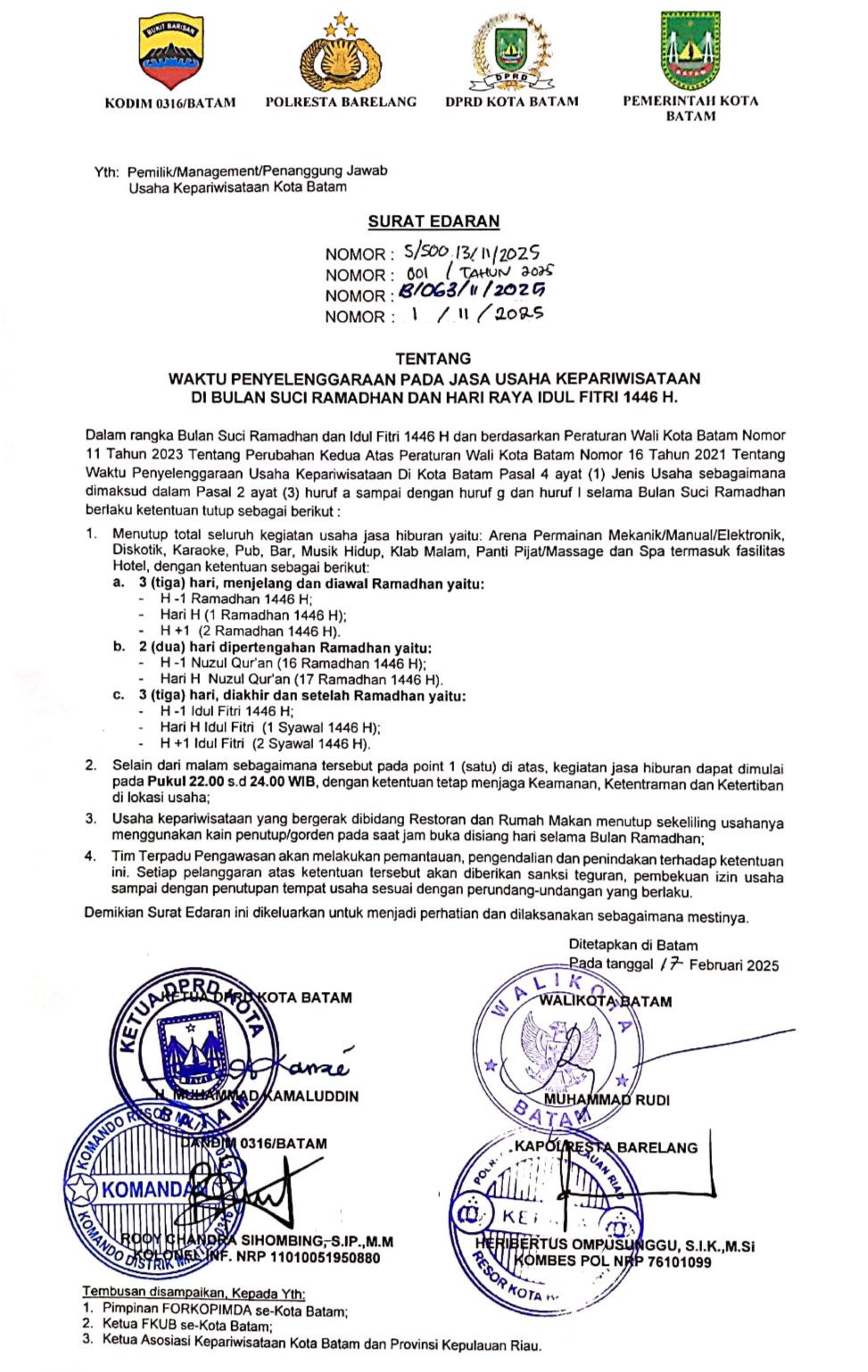 Forkopimda Kota Batam dalam satu Surat Edaran (SE) tertanggal 17 Februari 2025 telah mengatur pembatasan waktu penyelenggaraan usaha jasa hiburan hiburan selama bulan Ramadan.