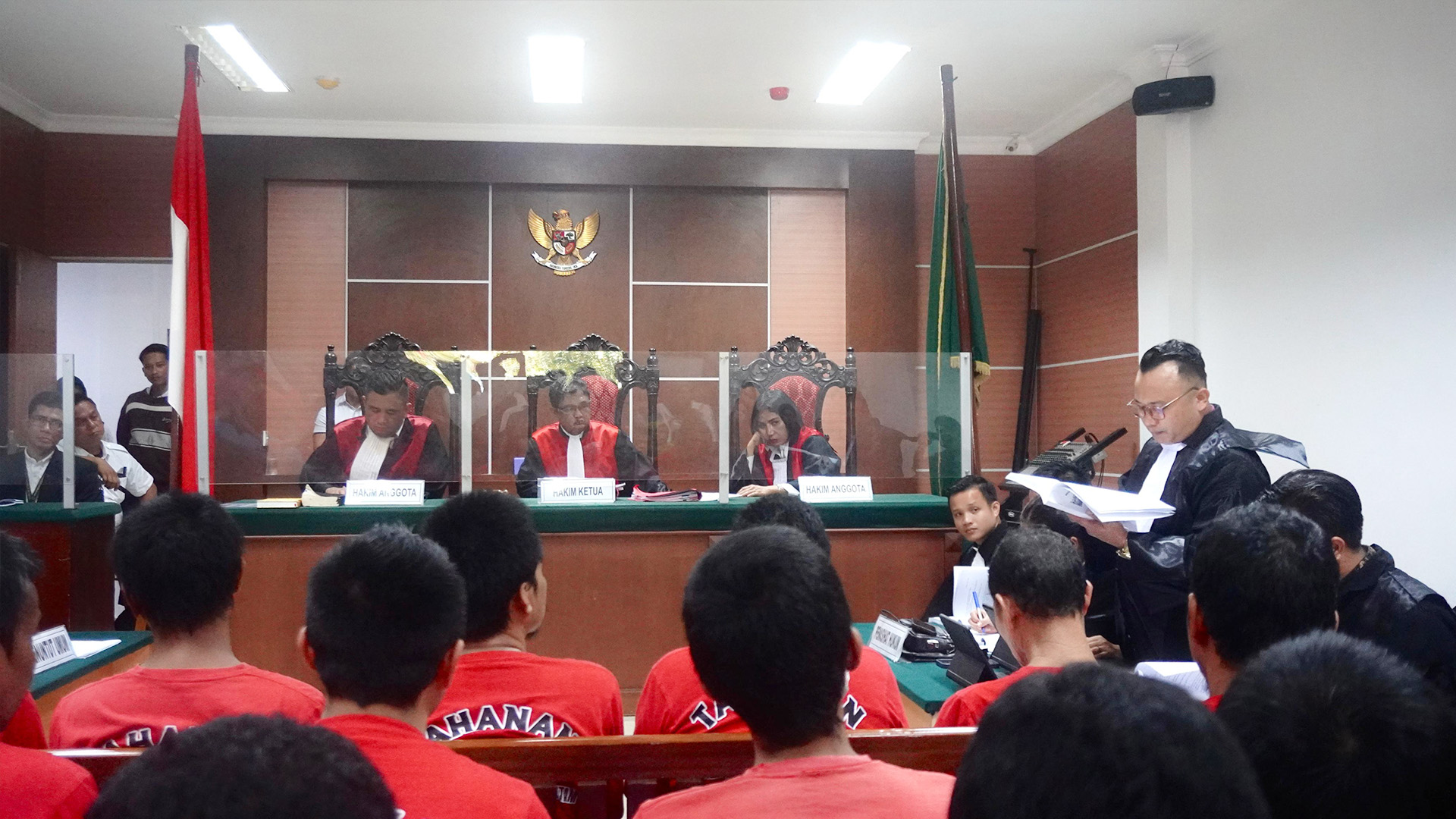Pembacaan pledoi bergantian oleh Sopandi SH, Mangara Sijabat SH MH, Nofita Putri Manik SH, Desti Wiranata Zega SH, dan Rio Ferdinan Turnip SH.