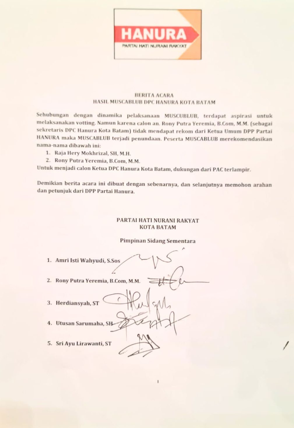Berita acara itu diteken oleh lima pimpinan sidang sementara termasuk Plt Ketua DPC Partai Hanura Batam Amri Isti Wahyudi. Ketua dan/atau sekretaris PAC pun ikut menandatangani. (Aman)