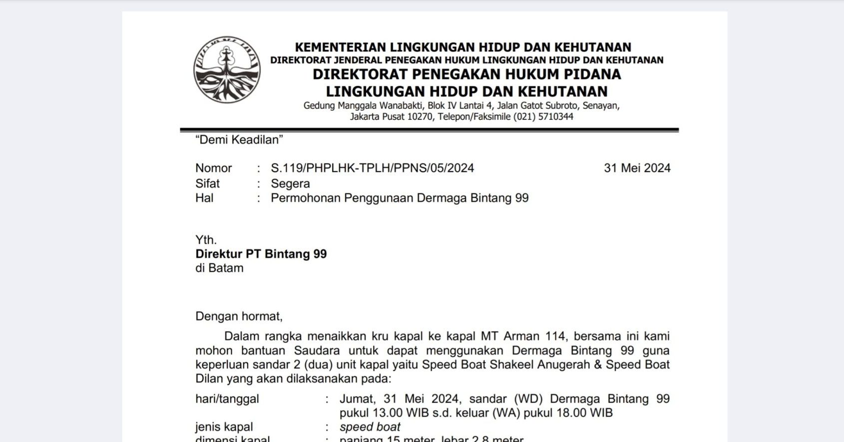 Surat tersebut ditujukan ke Direktur PT Bintang 99 sebagai permintaan izin penggunaan dermaga, pada surat tersebut, disebutkan adanya rencana untuk menaikkan kru kapal MT Arman 114.