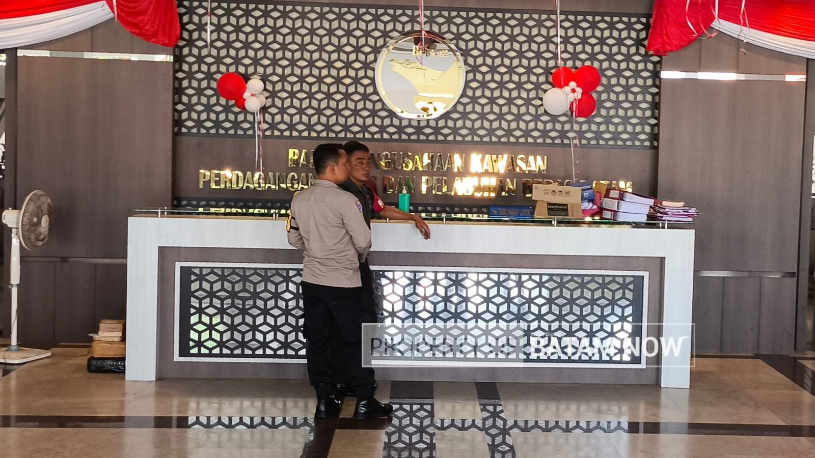 Seorang personel kepolisian menunggu di depan meja resepsionis di lantai 2 Gedung Bida BP Batam. (F: BatamNow)