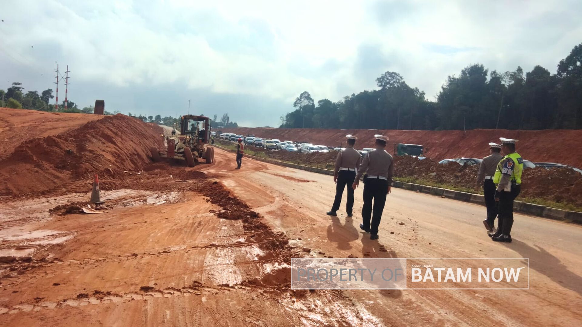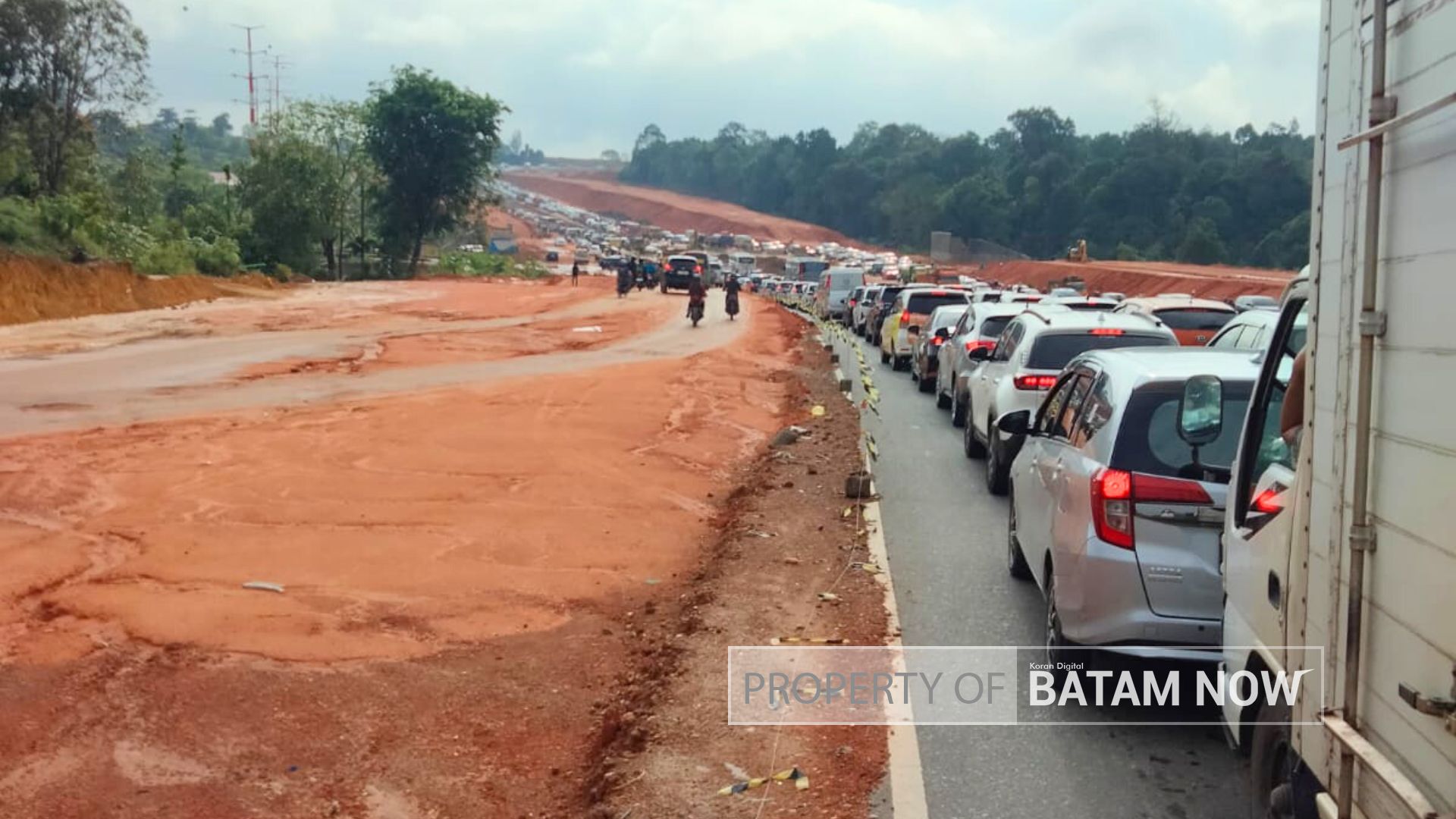 Amatan BatamNow.com di “TKP”, kemacetan terjadi disebab tanah proyek pelebaran jalan meluap terbawa air hujan deras yang mengguyur pada Senin (04/03/2024) malam.