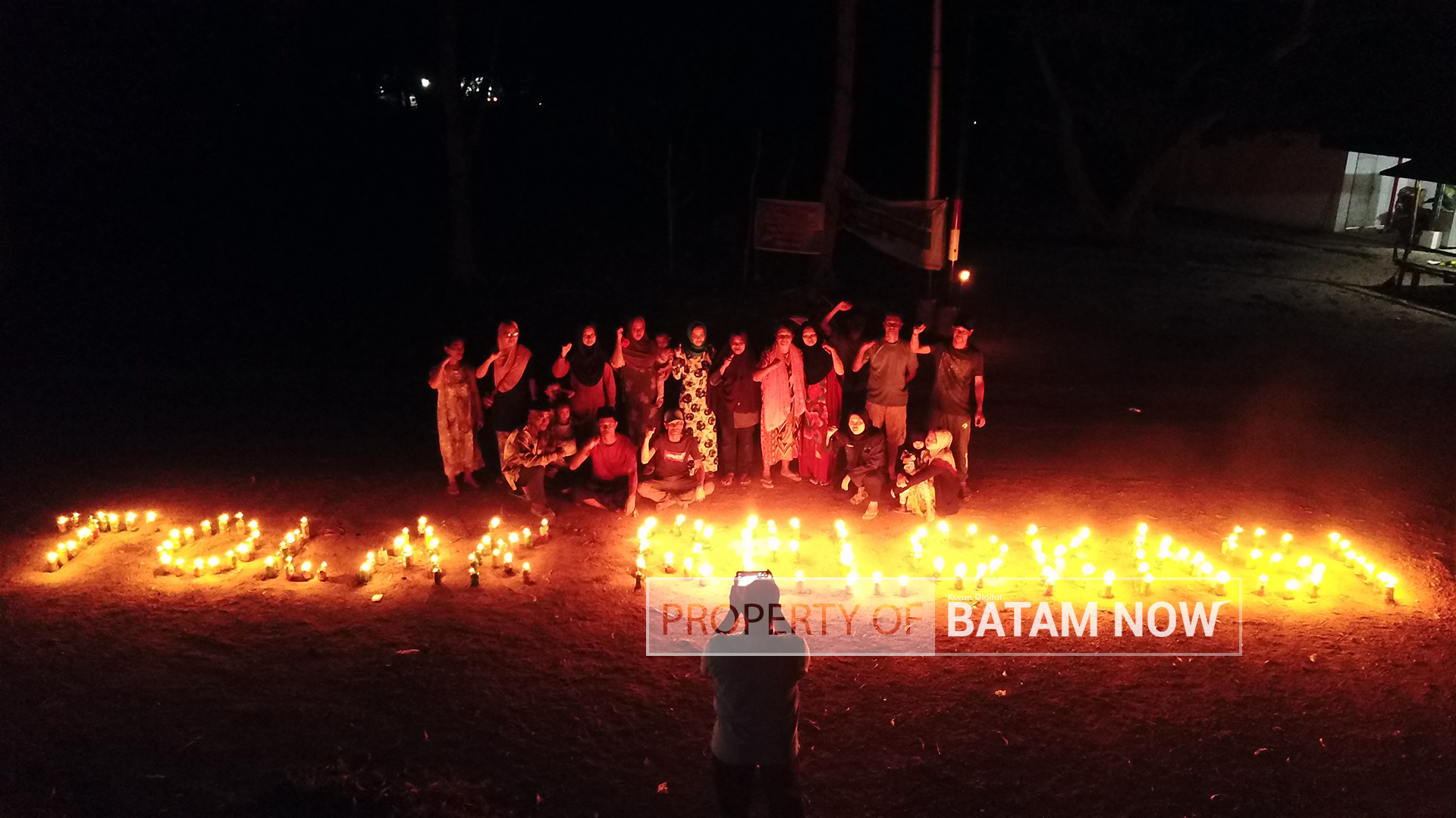 Di salah satu titik, warga menyusun pelita yang menyala di atas tanah membentuk frasa “TOLAK RELOKASI”.