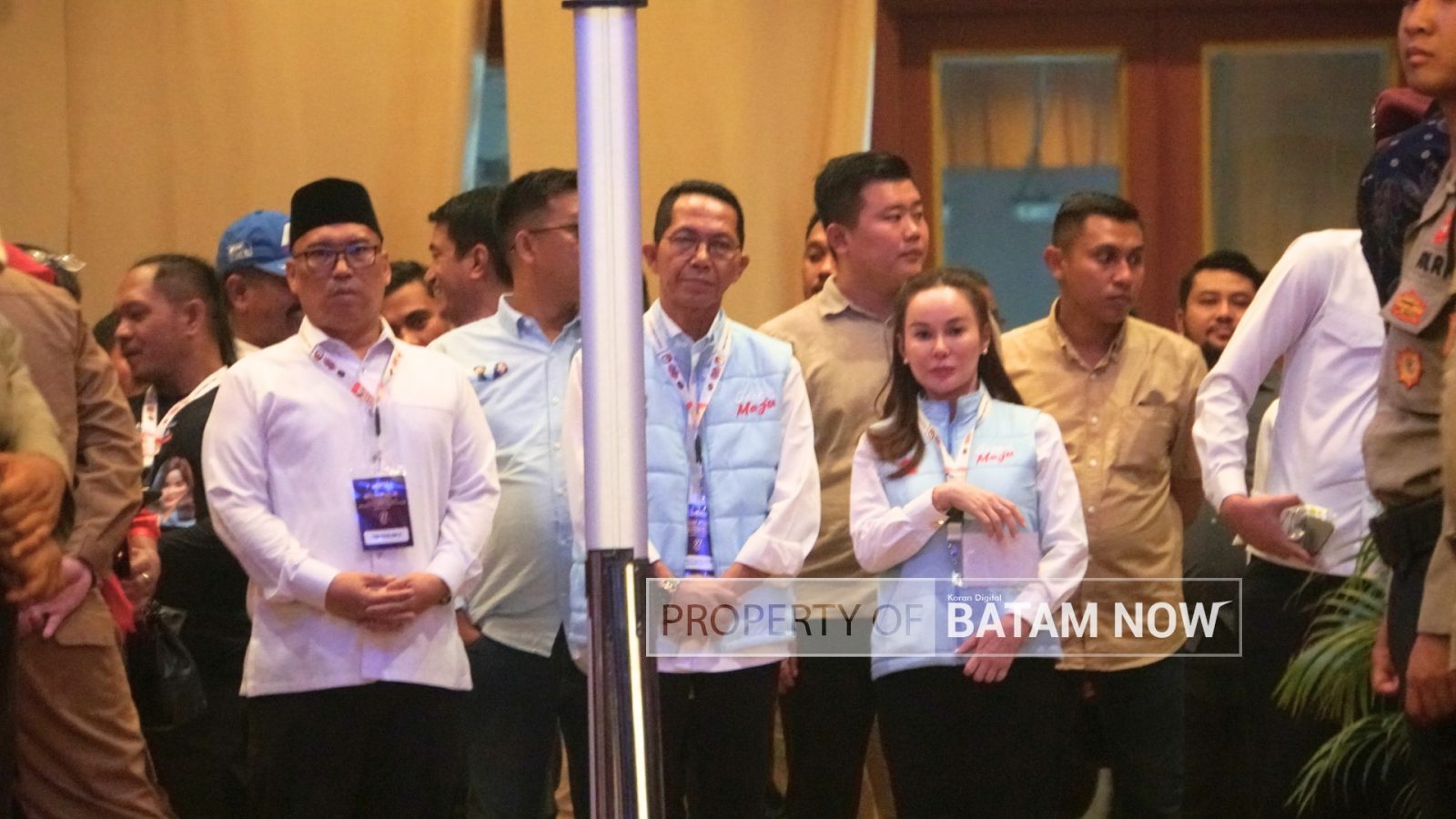 Pasangan calon wali kota dan Wakil Wali Kota Batam, Amsakar Achmad – Li Claudia Chandra (ASLI) berdiri di depan pintu masuk ruang debat Pilkada Batam di Crown Vista Hotel, ketika acara sudah dibuka dan dimulai, Jumat (15/11/2024). (F: BatamNow)