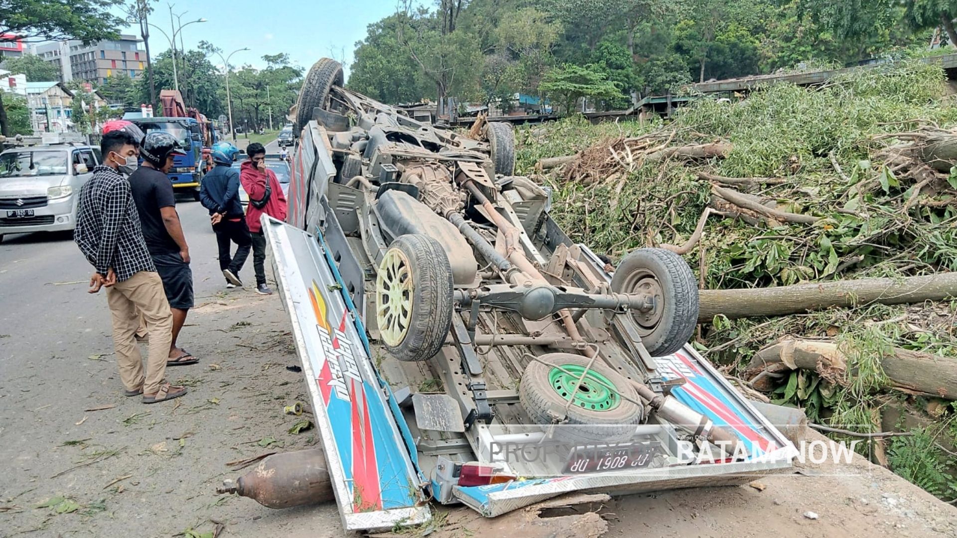 Pantauan BatamNow.com di lokasi, pick up merek Grand Max dengan nomor polisi BP 8061 DR itu dengan kondisi bumper depan penyok menghadap ke arah lalu lintas sebaliknya, ban depan kiri pecah dan penutup samping bak muatan ringsek.