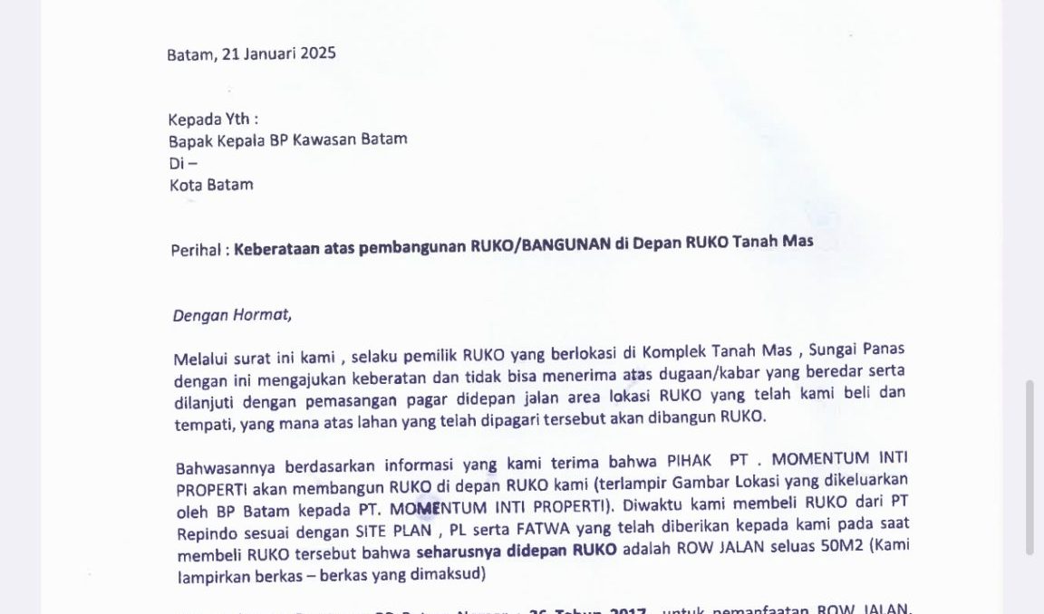 Para pemilik ruko yang merasa terganggu dengan pemagaran dengan seng berbahan pelat spandek dengan tiang baja ringan itu, lalu melaporkannya ke Kepala BP Batam pada 21 Januari 2025 dan ditembuskan ke beberapa instansi.