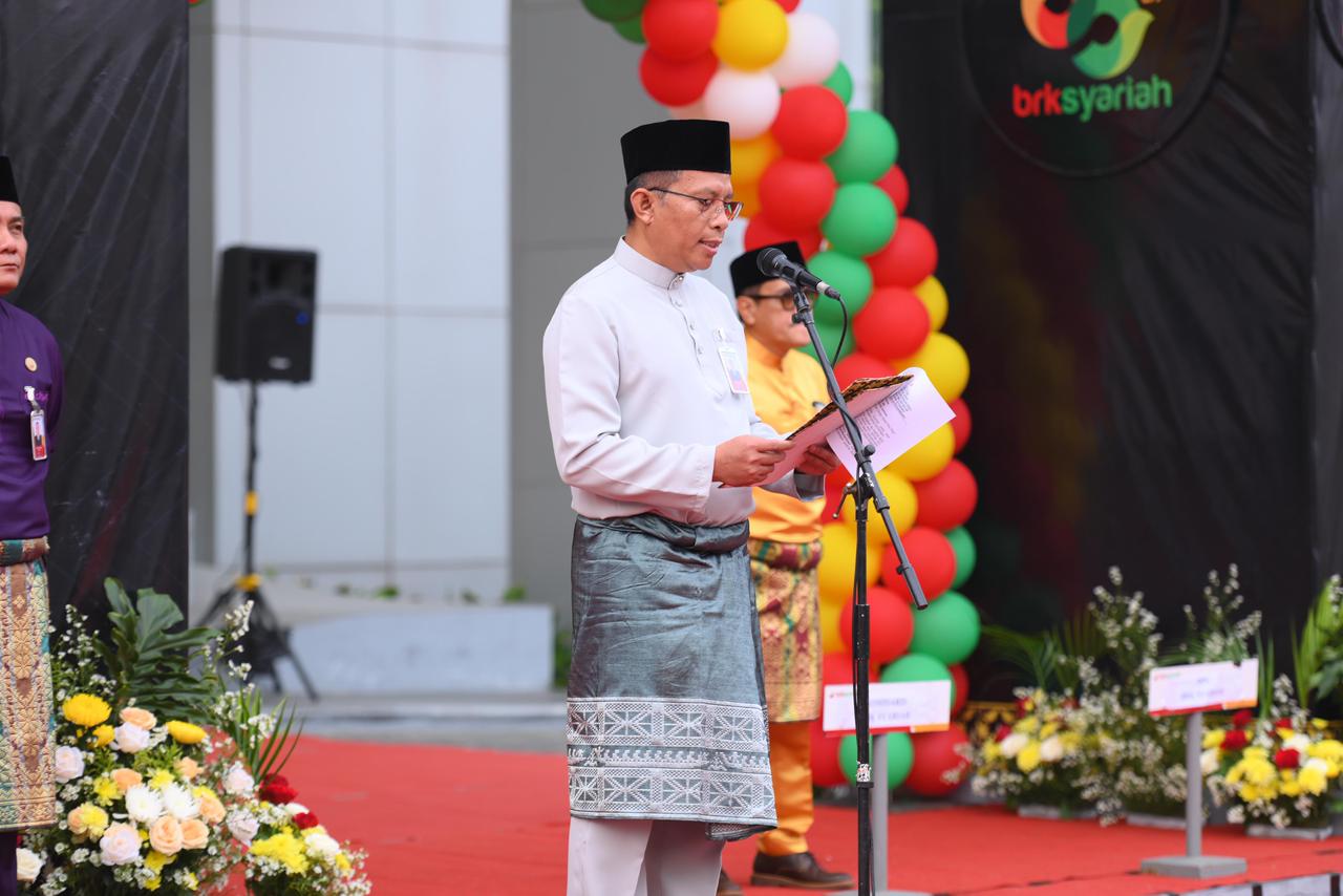 Upacara berlangsung tertib dan penuh penghayatan. Barisan peserta berdiri rapi, sementara para petugas upacara yang didominasi para pemimpin divisi tampil penuh wibawa menjalankan tugasnya. Di tengah suasana yang hening dan sarat kebanggaan itu, arah kebijakan Pemerintah Provinsi Riau untuk masa depan BRK Syariah disampaikan secara tegas.