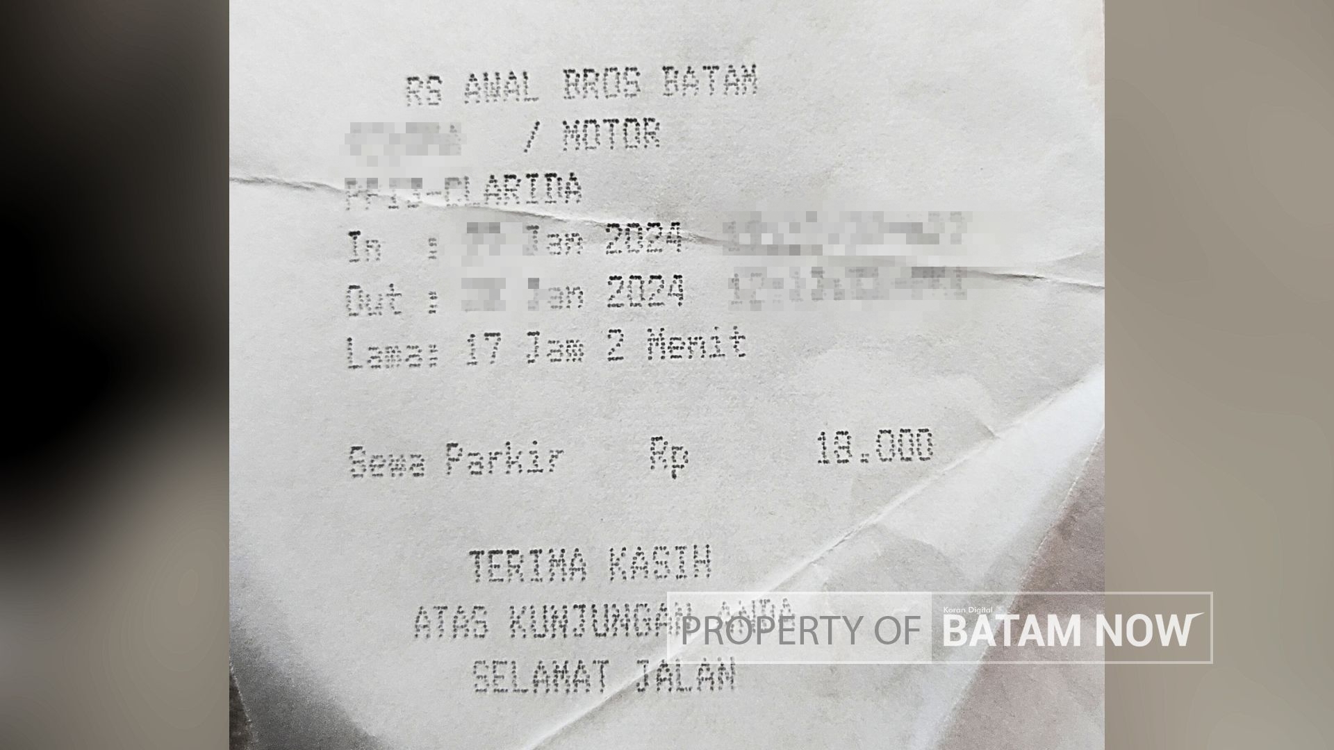 Resi pembayaran parkir sepeda motor di RS Awal Bros Batam selama 17 jam 2 menit (dibulatkan 18 jam) dikenakan biaya Rp 18 ribu sesuai Perwali Kota Batam Nomor 1 Tahun 2024. (F: BatamNow)