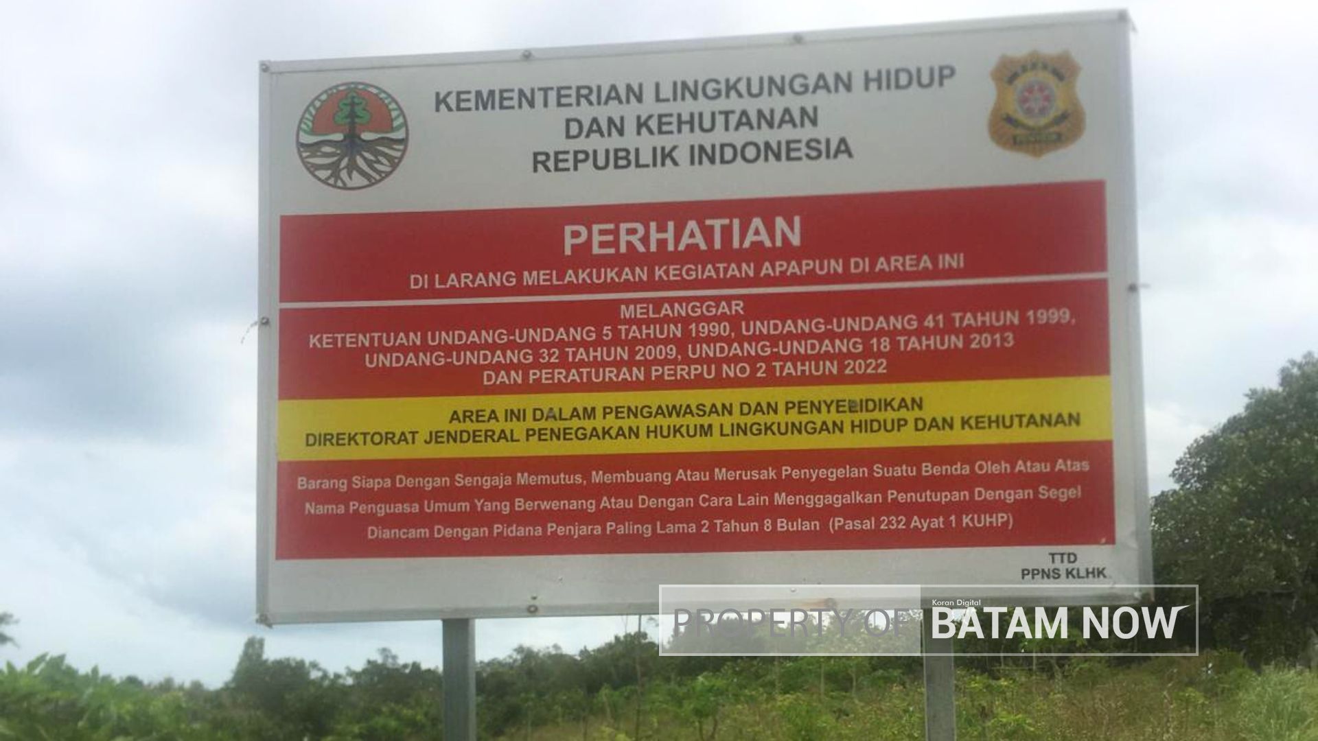 Papan peringatan dari beberapa instansi pemerintah tentang status hukum keberadaan lahan, hutan, pantai, laut Pulau Rempang yang memicu polemik itu.