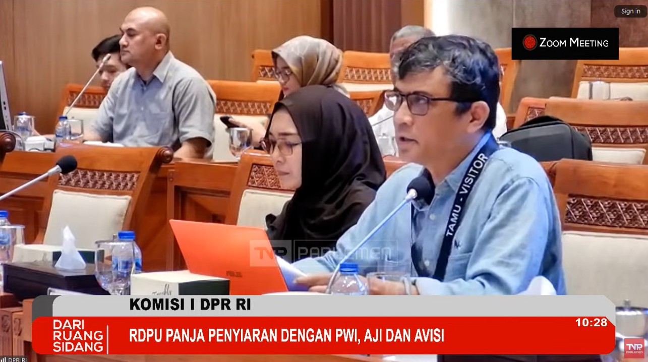 Ketua Umum PWI Pusat, Zulmansyah Sekedang (tengah), hadir dalam Rapat Dengar Pendapat Umum (RDPU) bersama Panja (Panitia Kerja) Rancangan Undang-Undang (RUU) Penyiaran, pada Senin (05/05/2025) di Gedung Parlemen, Jakarta Pusat. (F: Youtube/ TVR PARLEMEN)