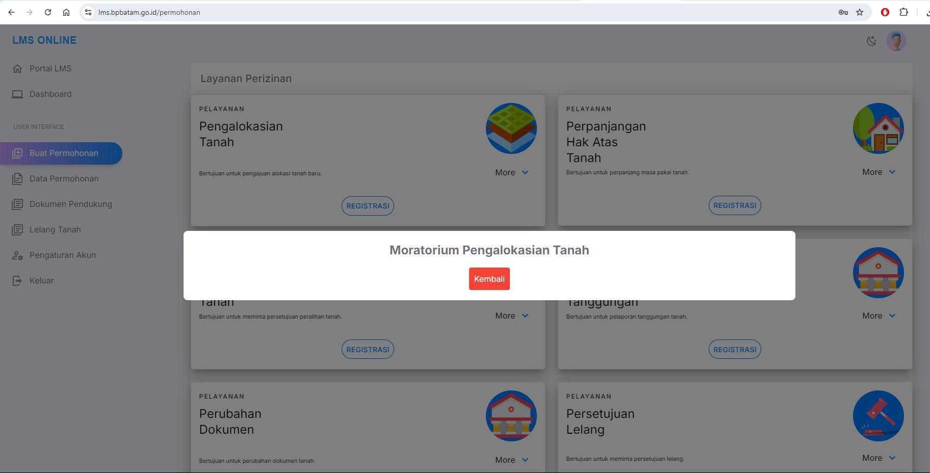 Ketika BatamNow.com masuk ke portal LMS BP Batam, Rabu (09/10/2024), tombol ‘Registrasi’ pada Pelayanan Pengalokasian Tanah hanya memberi respons notifikasi pop-up berisi teks “Moratorium Pengalokasian Tanah” dan tombol ‘Kembali’.