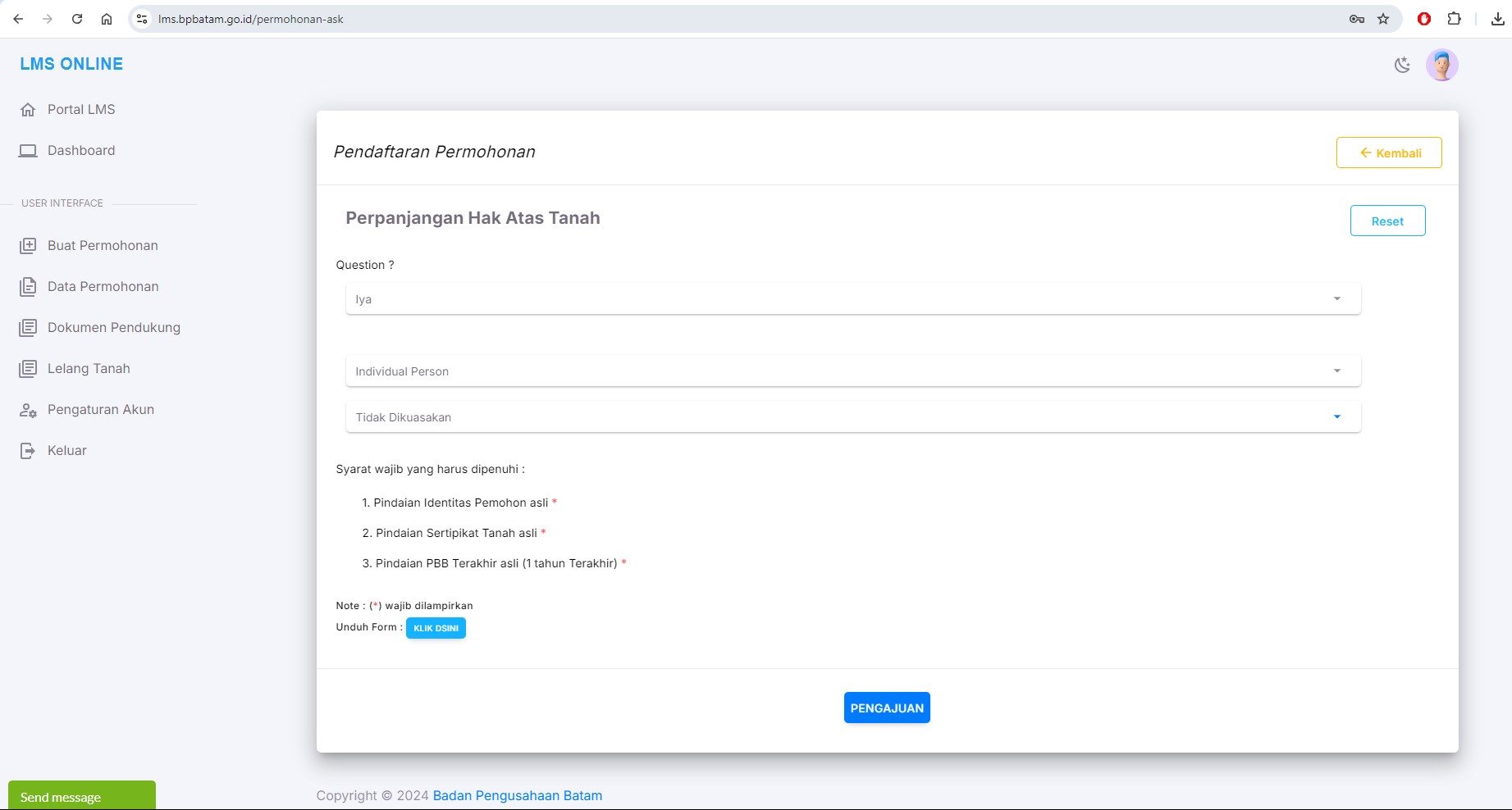 Sementara pelayanan lainnya, misalnya Pelayanan Perpanjangan Hak Atas Tanah, memberikan respons lanjutan proses ketika tombol ‘Registrasi’ ditekan.