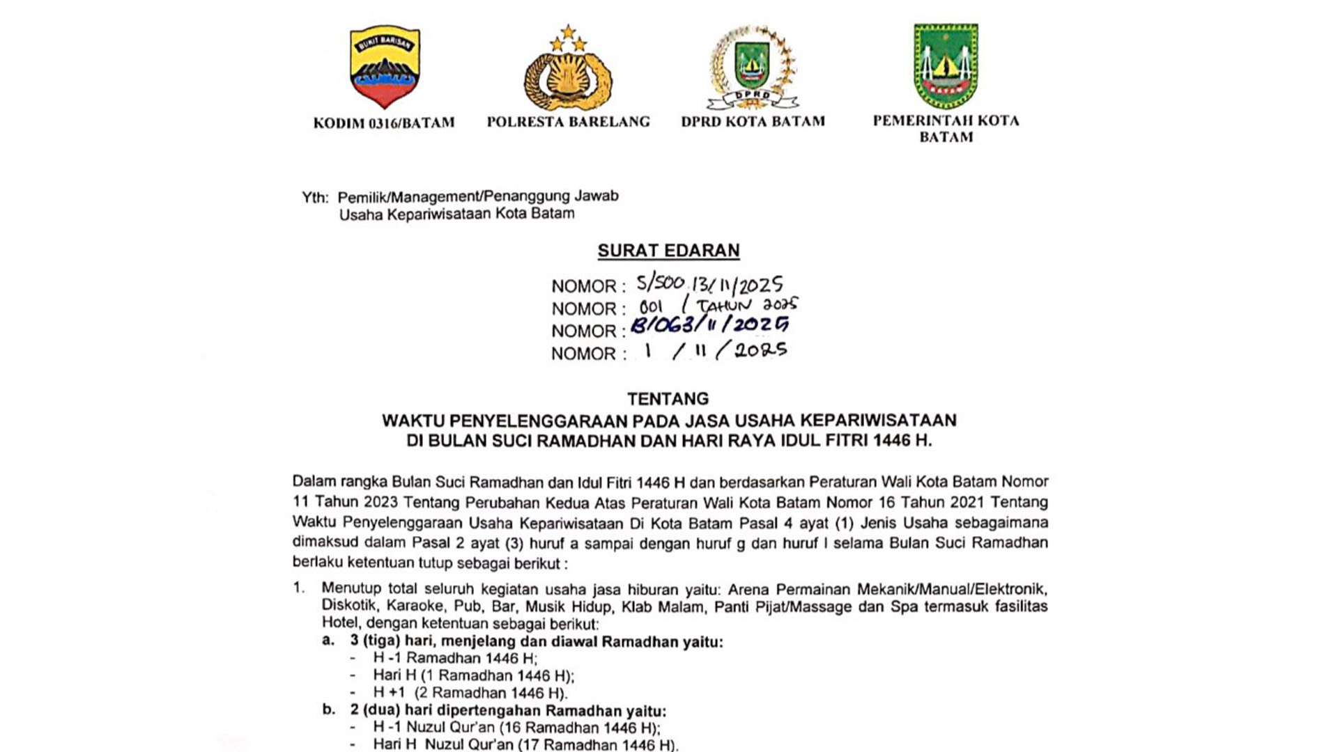 Dalam SE yang diteken empat pimpinan institusi di Batam itu, dirincikan waktu operasional selama Ramadan 1446 H untuk tempat hiburan seperti arena permainan mekanik/ manual/ elektronik, diskotek, karaoke, pub, bar, musik hidup, klab malam, panti pijat/ massage dan spa termasuk fasilitas hotel.