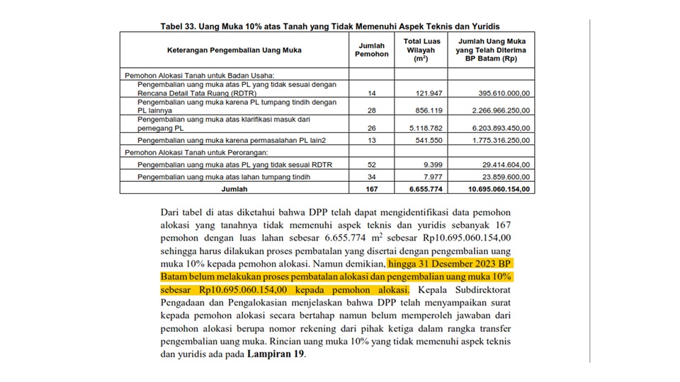 Kepada BPK disampaikan BP Batam, meski para pemohon alokasi telah membayar uang muka 10%, namun jika pemohon tidak layak secara yuridis dan teknis, permohonan pemohon dilakukan pembatalan disertai pengembalian uang muka 10%.