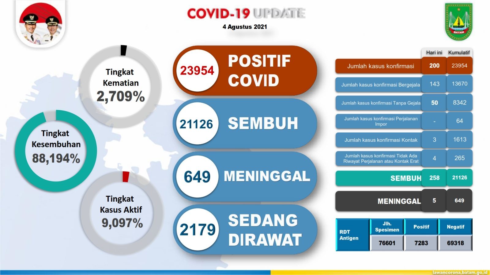 BatamNow.com – Rabu (04/08/2021), Kota Batam mencatatkan penambahan 258 orang sembuh dari Covid-19 sehingga totalnya menjadi 21.126 dengan tingkat kesembuhan 88,19 persen.